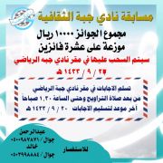 علماً بأن نادي جبة سيقوم بإجراء سحب على الجوائز خلال حفل سيقيمه النادي بتاريخ 22-9-1433هـ، بعد صلاة التراويح في نادي جبة.