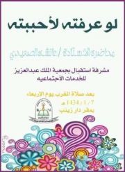 تقيم دار زينب لتحفيظ القرآن بمدينة جبه، غداً الأربعاء السابع من محرم، محاضره بعنوان \" لوعرفته لأحببته \" تلقيها الأستاذ عائشة الصعيدي، مشرفة آستقبال في جمعية الملك عبدالعزيز للخدمات الأجتماعيه.