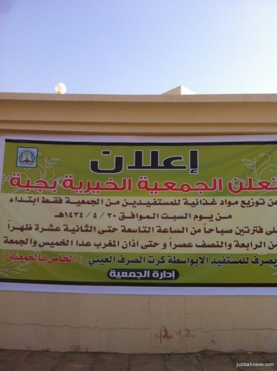 جبه (إخبارية جبه) فيصل الثليج : تعلن الجمعيه الخيريه بجبه، عن توزيع مواد غذائيه للمستفيدين من الجمعيه، وذلك أبتداءً من يوم السبت 20 / 4 / 1434 هـ، على فترتين صباحيه ومسائيه على أن تبدأ الفتره الصباحيه من الساعه التاسعه صباحاً وحتى الثانيه عشر ظهراً، وستكون الفتره المسائيه، من الساعه الرابعه والنصف عصراً وحتى أذان المغرب.