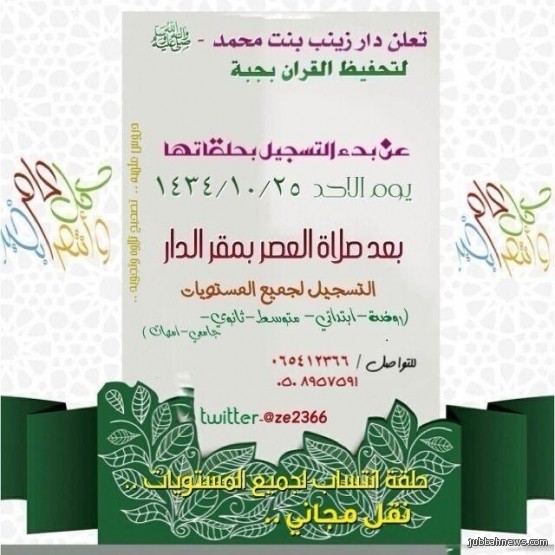 جبه (إخبارية جبه) : تعلن دار زينب النسائيه لتحفيظ القرآن الكريم بجبة عن بدء التسجيل في حلقات التحفيظ القران للعام الدراسي الحالي، وذلك لجميع المستويات (روضه وإبتدائي ومتوسط وثانوي وجامعي وأمهات)