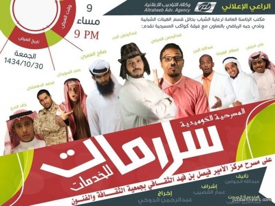 جبة (إخبارية جبة) : يقيم مكتب رعاية الشباب بحائل قسم الهيئات الشبابيه ونادي جبة وبالتعاون مع فرقة كواكب المسرحيه يقدمون مسرحية سلامات للخدمات الكوميديه والتي ستقام مساء غدٍ الجمعه الثلاثون من شهر شوال في مسرح مركز الأمير فيصل بن فهد الثقافي بجمعية الثقافه والفنون بحائل وذلك عند الساعه التاسعه مساءً.