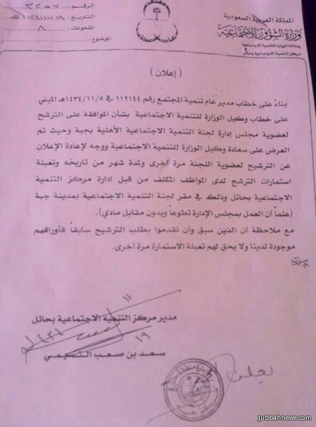 جبة (إخبارية جبة) اصدر سعادة وكيل وزارة الشؤون الاجتماعيه للتنمية الأجتماعيه بإعادة اعلان الترشح لعضوية مجلس إدارة لجنة التنمية الأجتماعيه بمدينة جبه مرة أخرى وذلك لمدة شهر من تاريخ الاعلان الموافق ل 19 / 11 / 1434 هـ، وتعبئة استمارات الترشح لدى الموظف المكلف من قبل إدارة مركز التنمية الاجتماعيه بحائل وذلك في مقر لجنة التنمية الاجتماعيه بمدينة جبه.