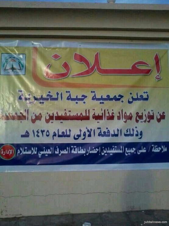 جبة (إخبارية جبة) : أعلنت الجمعيه الخيريه بمدينة جبه عن صرف الدفعه الأولى من المواد الغذائيه لمستفيدين من الجمعيه وذلك لعام 1435 هـ.