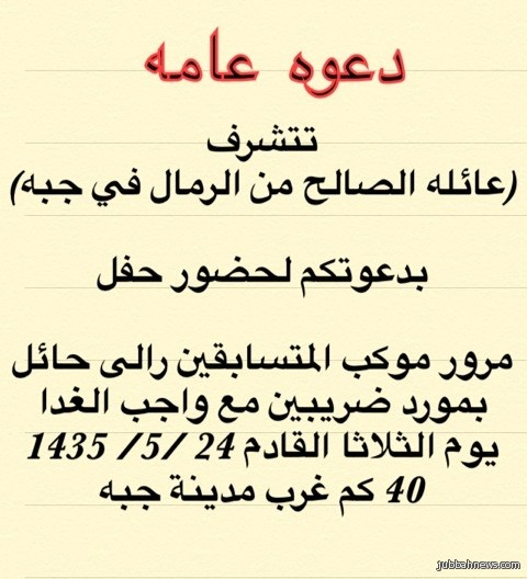 جبة (إخبارية جبة) : تتشرف جماعة الصالح من الرمال في مدينة جبه بدعوتكم لحضور حفل مرور موكب المتسابقين رالى حائل بمورد ضريبين، وتناول واجب الغداء وذلك يوم الثلاثاء القادم 24 /5/ 1435، غرب مدينة جبه 40 ك.