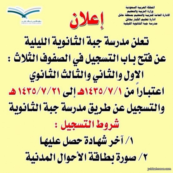 حيث أوضح مدير ثانوية جبه الأستاذ بندر طلال الرميح، أن مدرسة ثانوية جبه الليله بدأت في استقبال طلبات التسجيل في الصفوف الثلاث الأول والثاني والثالث ثانوي خلال المده المحدده، مضيفاً أن على الطلاب الراغبين في التسجيل زيارة مدرسة جبه الثانويه خلال الدوام الرسمي والتقديم مصطحبين معهم أخر شهاده حصل عليها وصوره من بطاقة الأحوال المدنيه.