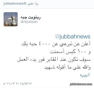حيث تكفل احد المغردين ب 4000 بلك و 100 كيس اسمنت يتم وضعها بحال بدأت الأعمال، جاء ذلك رادً على الخبر ذاته في موقع التواصل الأجتماعي بالتويتر.
