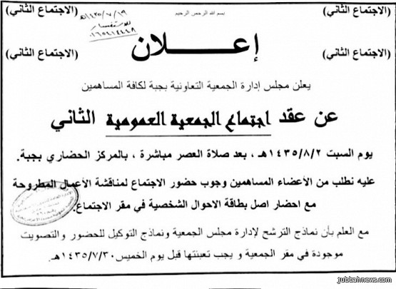 واوضح الأستاذ راشد المزاوم ان الجمعيه التعاونيه متعددة الأغراض بمدينة جبه ستعقد إجتماع الجمعيه العموميه الثاني يوم السبت المقبل الثاني من شعبان وذلك لمناقشة عدد من المواضيع والترشح لمجلس الإداره الجديد، مؤكداً انه يتوجب على المساهمين تعبئة إستمارات الترشيح والوكاله في مقر الجمعيه بموعد اقصاه يوم الخميس الثلاثين من رجب في مقر الجمعيه.