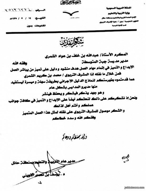 جبة (إخبارية جبة) عبدالرحمن خميس الرويق : بناءً على مرئيات المشرفين التربوين في تعليم حائل، قدم سعادة الدكتور يوسف بن محمد الثويني مدير الإداره العامه للتربيه والتعليم شكره وتقدير للأستاذ عبدالله خلف العواد مدير مدرسة متوسطة جبه.
