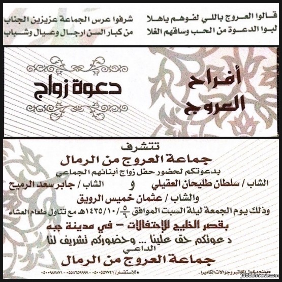 من جهتها قدمت جماعة العروج الدعوة للجميع لحضور حفل الزواج الجماعي الأول لأبناء العروج وذلك مساء يوم الجمعه الموافق لـ 5/ 10/ 1435هـ في قصر الخليج للأحتفالات بمدينة جبه، سائلين المولى عزوجل التوفيق لهم وان يرزقهم الله حياة زوجيه سعيده.