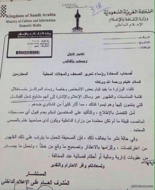 جبة (إخبارية جبة) خاص : إشارةً لتعميم الصادر من وزارة الثقافه والأعلام، حول قيام بعض الصحف والمجلات المحليه، بكتابة كلمة شيخ او شيخ شمل وغيره من المسميات والتي لا يملك أصحابها أي شيء يثبت أنهم مشائخ والذي يصدر من وزارة الداخليه ويملك ختم بنفس مسماه.