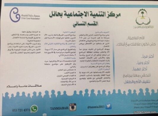 حائل (إخبارية جبة) : يعلن مركز التنمية الاجتماعية بحائل القسم النسائي عن إقامة دورة ( تثقيف الأم والطفل ) والذي يقدم مجاناً للأمهات والمهتمات برعاية الاطفال ولمدة 25 أسبوع بواقع يوم واحد 3 ساعات، والبرنامج يقدم محاور متميزه وفعاله على جزأين، الجزء الأول يدعم الأم نفسياً وتربويا، وأما الجزء الأخر فهو للتدريب المعرفي للطفل .