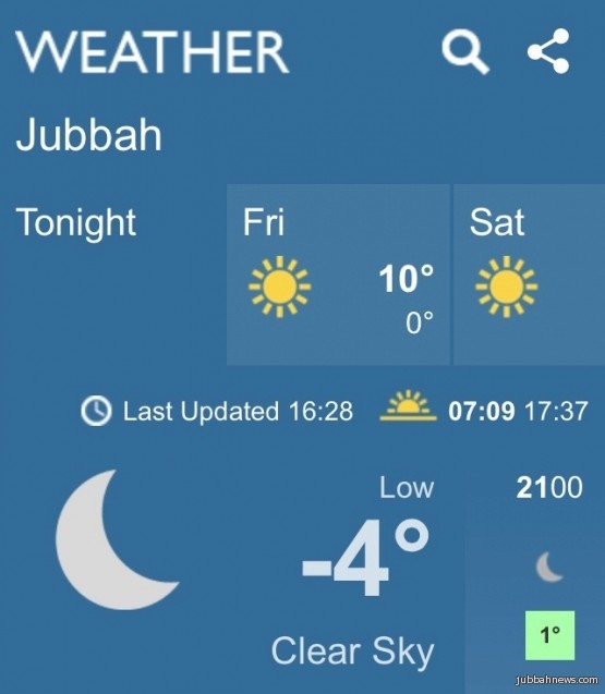وبحسب موقع BBC للطقس أن مدينة جبة ستنخفض درجات الحرارة إلى 4 دون الصفر مساء اليوم وستستمر هذه الموجه حتى يوم الأحد من المحتمل ان تصل لما دون الثمان درجات تحت الصفر، والله أعلم.