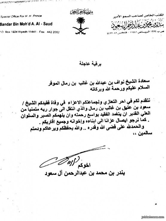 جبة (إخبارية جبة) حمود الصايل: قدم الشيخ نواف الغالب بالغ شكره وعرفانه لكل من شارك في عزاء فقيدهم سعود بن عتيق الغالب، وثمن مشاركة صاحب السمو الامير بندر بن محمد عبدالرحمن ال سعود وذلك ببعث برقية عزاء ومواساة في وفاة المرحوم سعود عتيق الغالب رحمه الله.