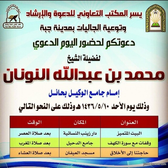 جبة (إخبارية جبة) موفق فهد المفضي: يقيم مكتب الدعوة والأرشاد وتوعية الجاليات في مدينة جبة، اليوم الدعوي لفضيلة الشيخ محمد بن عبدالله النونان أمام جامع الوكيل في حائل، وذلك يوم الأحد العاشر من جماد الأول.