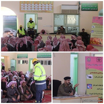 حيث كان في إستقبالهم لدى وصولهم مدير المدرسة الأستاذ بندر طلال الرميح, وقد أوضح النقيب سعدون العنزي خلال المحاظره عن سبل الوقاية من الحوادث ومخاطر الحرائق واسباب نشوبها وكيفية مكافحتها, وتم التوزيع على الطلاب عدد من المنشورات التوعوية.