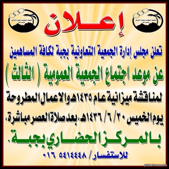 جبة ( إخبارية جبة ) : تعلن الجمعية التعاونية متعددة الاغراض في مدينة جبة لكافة المساهمين عن موعد اجتماع الجمعية العمومية (الثالث) وذلك بهدف مناقشة ميزانية عام ١٤٣٥هـ والاعمال المطروحة وسيكون موعد الاجتماع يوم الخميس ٢٠-٦-١٤٣٦هـ في المركز الحضاري بجبة عقب صلاة العصر مباشرة وللاستفسار ٠١٦٥٤١٤٤٤٨ .
