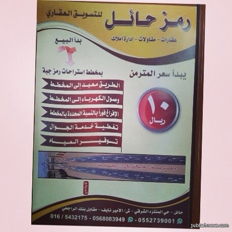 جبة ( إخبارية جبة ) : يعلن مكتب رمز حائل للتسويق العقاري عن بدأالبيع بمخطط إستراحات رمز جبة, والذي يمتاز بالطريق المعبد وكذلك وصول الكهرباء والأفراغ فورا بالنسبة المحددة في المخطط ويمتاز كذلك بتغطية خدمة الجوال وتوفير المياه.