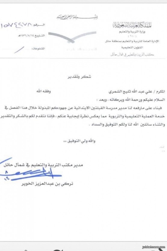 جبة (إخبارية جبة) عبدالرحمن خميس الرويق: من ضمن مايقدمه مكتب التربية والتعليم شمال حائل في تشجيع ودعم الكوادر التعليميه من معلمين ومشرفين وإداريين، تلقى الأستاذ علي عبدالله الثليج أحد معلمي مدرسة القبلتين الابتدائيه في جبة خطاب شكر وتقدير من مدير مكتب التربية والتعليم شمال حائل نظير جهوده المبذوله في العام الدراسي 1435 - 1436 هـ.