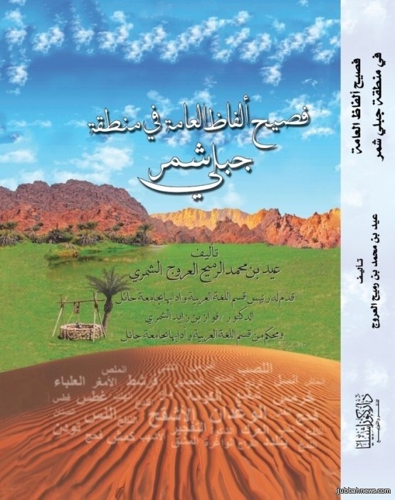 جبة (إخبارية جبة) عبدالرحمن خميس الرويق: أصدر الشيخ عيد محمد الرميح كتابه الجديد والذي جاء بعنوان "فصيح ألفاظ العامة في منطقة جبلي شمر"، والذي جمع اكثر من 700 كلمة عامية وثقها بمرجع كل كلمة من كتب التفسير أو الحديث أو المعاجم اللغوية المعتمدة ليكون القارئ على يقين من صحة نسبة هذه الكلمات للغة العربية.
