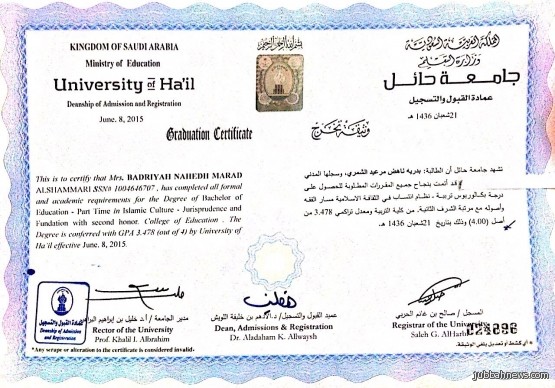 جبة (إخبارية جبة) سالم المشاري: أنهت الإستاذه بدريه ناهض المرعيد دراسة البكالوريس في التربيه تخصص الثقافة الإسلاميه مسار الفقه وأصوله، بنظام الإنتساب من جامعة حائل وذلك بتقدير ممتاز مع مرتبة الشرف الثانيه.