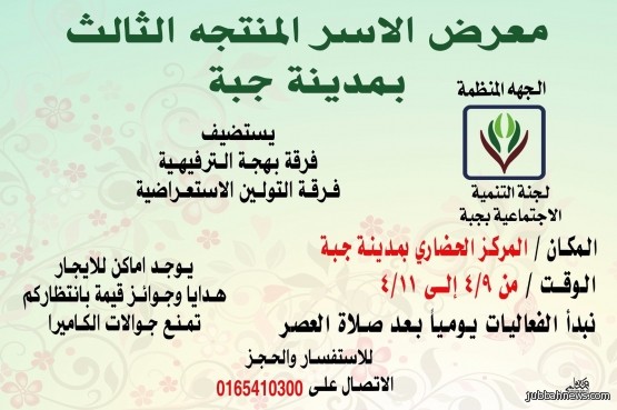 وأكد الأستاذ فهد المشناء رئيس لجنة التنمية الإجتماعية في جبة، أنه تواصلاً لإنشطة التنمية في دعم الأسر المنتجة والعمل على تسويق منتجاتها، في سبيل توفير فرص العمل ورأس مال، مضيفاً أن هذا المعرض ستقام فعالياته في المركز الحضاري بمدينة جبة ويستضيف فرق ترفيهية وإستعراضية، وأن هناك اماكن للإيجار وكذلك سيتم توزيع جوائز قيمة وهدايا للحاضرين.