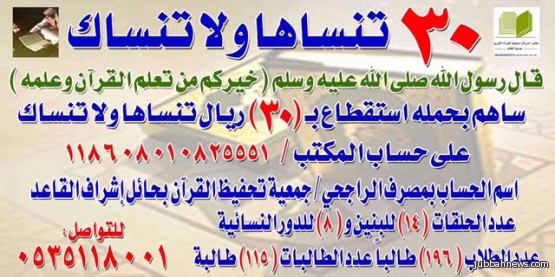 جبة (إخبارية جبة) عبدالرحمن خميس الرويق, فضيل ملهي الفضيل: اطلق مكتب إشراف حلقات تحفيظ القران بالقاعد اليوم حملة تحت شعار "30 تنساها .. ولا تنساك" وذلك لدعم المكتب والتبرع له في سبيل إستمرار هذا العمل المبارك.
