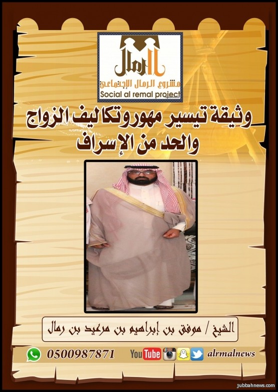 وعبر الشيخ موفق بن إبراهيم بن مرعيد عن بالغ سعادته لما وجده من عمل يفتخر به عندما قاموا ابناء الرمال في إنشاء هذه الوثيقة المباركة والتي ستسهم في مساعدة الشباب على الزواج والقضاء على العنوسة، مؤكداً أن مثل هذه المبادرات يجب التعاون معها في سبيل إنجاحها والعمل تذليل كل مايتعرضها من عوائق.