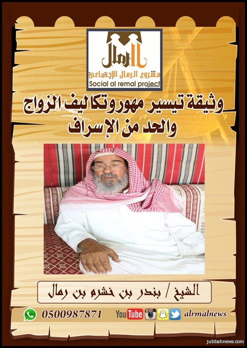 حيث رحب الشيخ بندر بن خشرم بن رمال بهذه المبادرة الكريمة وقدم دعمه وتأييده لها وبارك مسعى الفريق في تيسير تكاليف الزواج على ابناء الرمال سائلاً المولى عزوجل التوفيق والسداد للجميع.