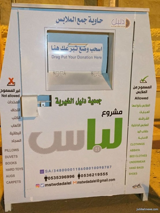 في بادرة رائعة قامت بها دار زينب بنت محمد لتحفيظ القرآن الكريم بجبة بالتعاون مع جمعية دليل الخيرية بحائل بوضع حاويات لجمع الملابس بانواعها والعبايات والشراشف... وتم توزيعها بخمس مواقع بجبة