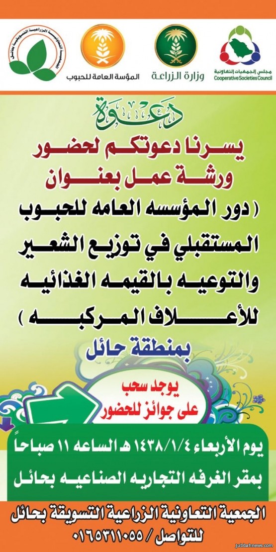 تقيم الجمعية التعاونية الزراعية التسويقية بحائل صباح يوم الاربعاء القادم الموافق ١٤٣٨/١/٤ ، الساعة ١١ صباحاً في قاعة الشيخ علي الجميعة رحمه الله بالغرفة التجارية الصناعية بحائل ، ورشة عمل بعنوان (دور المؤسسة العامة للحبوب المستقبلي في توزيع الشعير والتوعية بالقيمة الغذائية للأعلاف المركبة)
