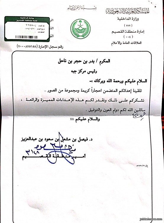 من جهته ثمن سعادة رئيس إمارة جبة بدر بن حجر بن ناحل، شكر وتقدير صاحب السمو الملكي الأمير الدكتور فيصل بن مشعل بن سعود بن عبدالعزيز أمير منطقة القصيم وانه بمثابة الإعتزاز والفخر.